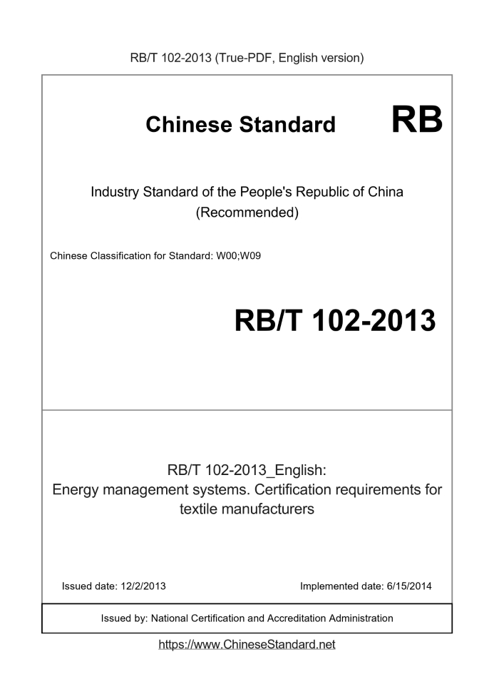 Delivery: <= 5 days. True-PDF full-copy in English will be manually translated and delivered via email. RB/T 102-2013: Energy management systems. Certification requirements for textile manufacturers Status: Valid