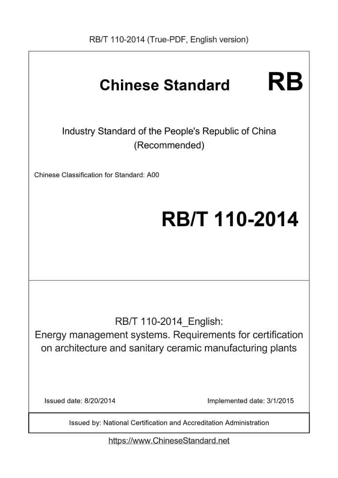 Delivery: <= 5 days. True-PDF full-copy in English will be manually translated and delivered via email. RB/T 110-2014: Energy management systems. Requirements for certification on architecture and sanitary ceramic manufacturing plants Status: Valid