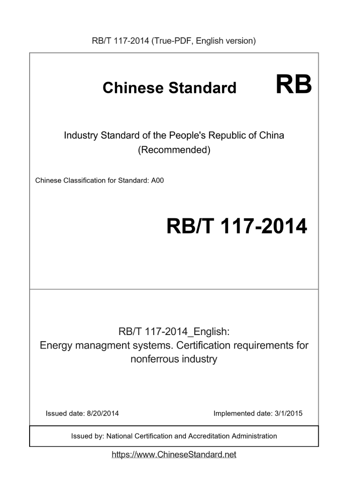 Delivery: <= 6 days. True-PDF full-copy in English will be manually translated and delivered via email. RB/T 117-2014: Energy managment systems. Certification requirements for nonferrous industry Status: Valid