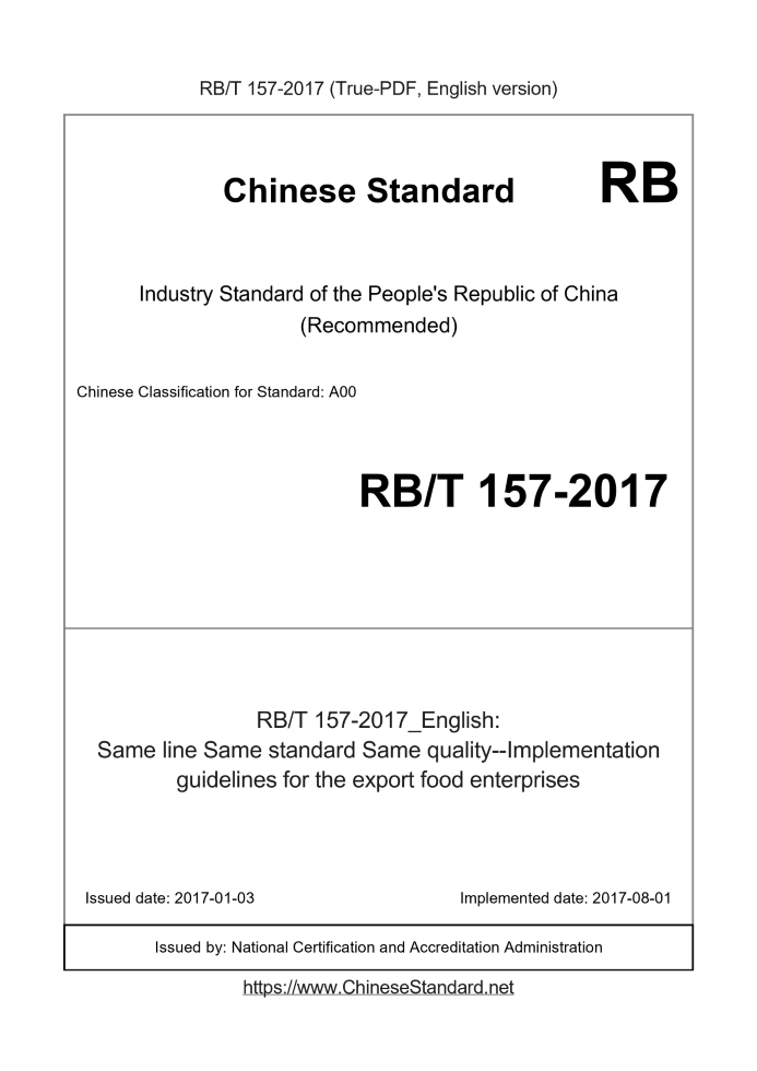 Delivery: <= 3 days. True-PDF full-copy in English will be manually translated and delivered via email. RB/T 157-2017: Same line Same standard Same quality--Implementation guidelines for the export food enterprises Status: Valid