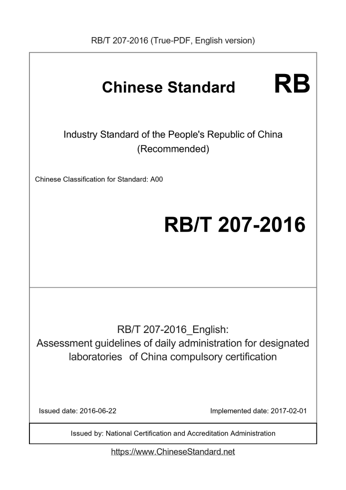 Delivery: <= 3 days. True-PDF full-copy in English will be manually translated and delivered via email. RB/T 207-2016: Assessment guidelines of daily administration for designated laboratories of China compulsory certification Status: Valid