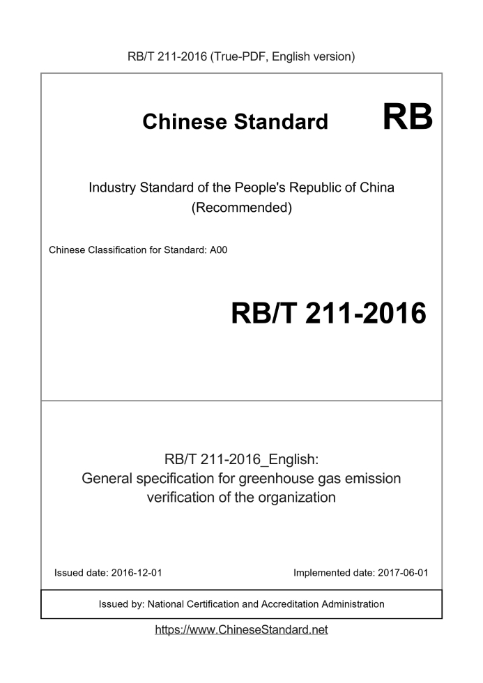 Delivery: <= 4 days. True-PDF full-copy in English will be manually translated and delivered via email. RB/T 211-2016: General specification for greenhouse gas emission verification of the organization Status: Valid