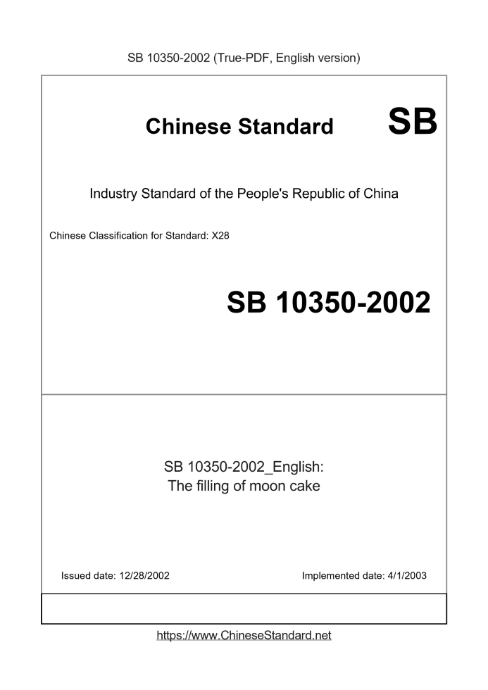 Delivery: <= 3 days. True-PDF full-copy in English will be manually translated and delivered via email. SB 10350-2002: The filling of moon cake Status: Obsolete