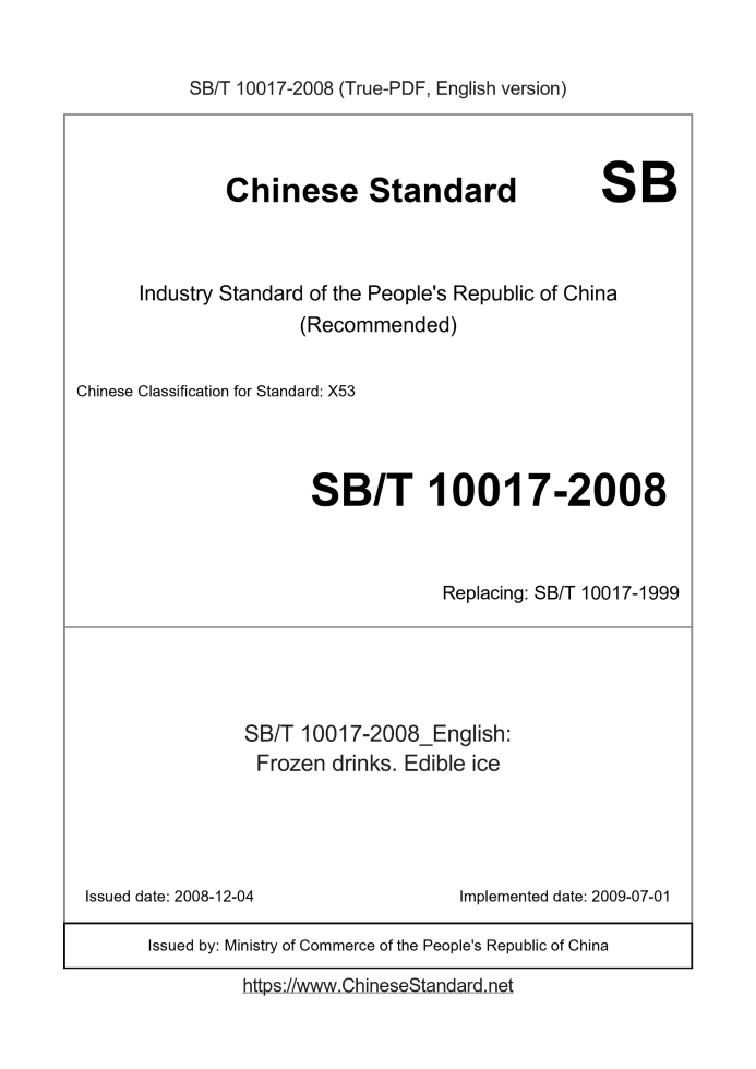 Delivery: <= 3 days. True-PDF full-copy in English will be manually translated and delivered via email. SB/T 10017-2008: Frozen drinks. Edible ice Status: Valid SB/T 10017: Historical versions