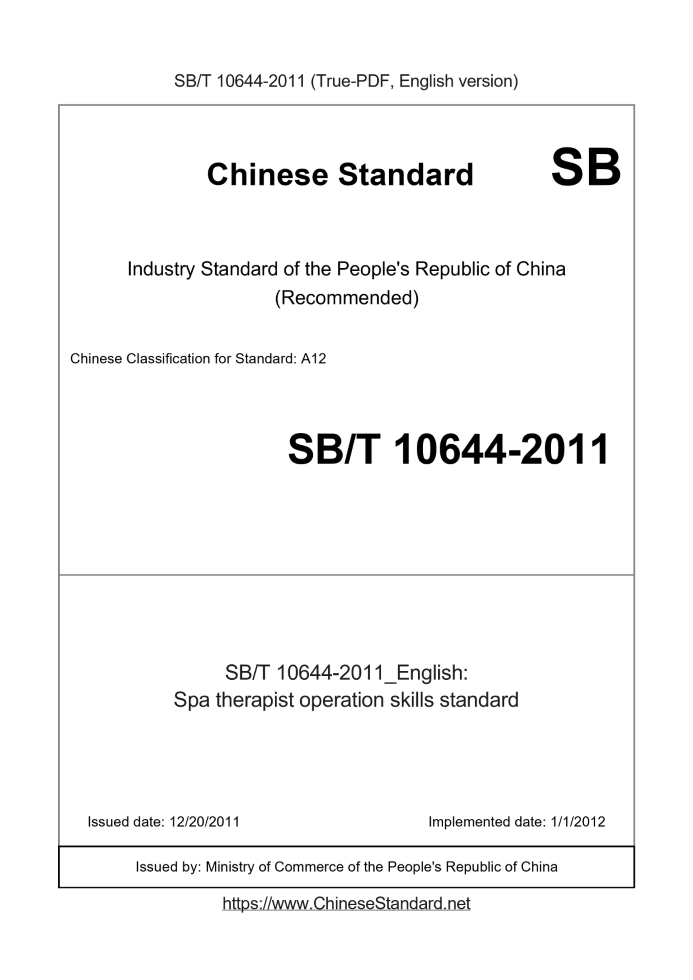 Delivery: <= 3 days. True-PDF full-copy in English will be manually translated and delivered via email. SB/T 10644-2011: Spa therapist operation skills standard Status: Valid