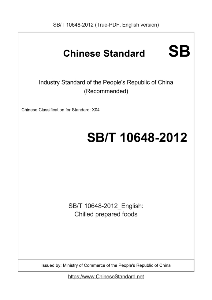 Delivery: <= 3 days. True-PDF full-copy in English will be manually translated and delivered via email. SB/T 10648-2012: Chilled prepared foods Status: Valid