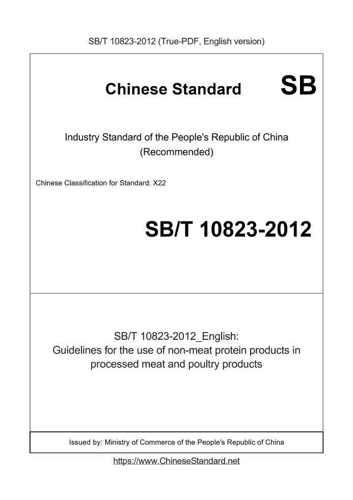 Delivery: <= 3 days. True-PDF full-copy in English will be manually translated and delivered via email. SB/T 10823-2012: Guidelines for the use of non-meat protein products in processed meat and poultry products Status: Valid