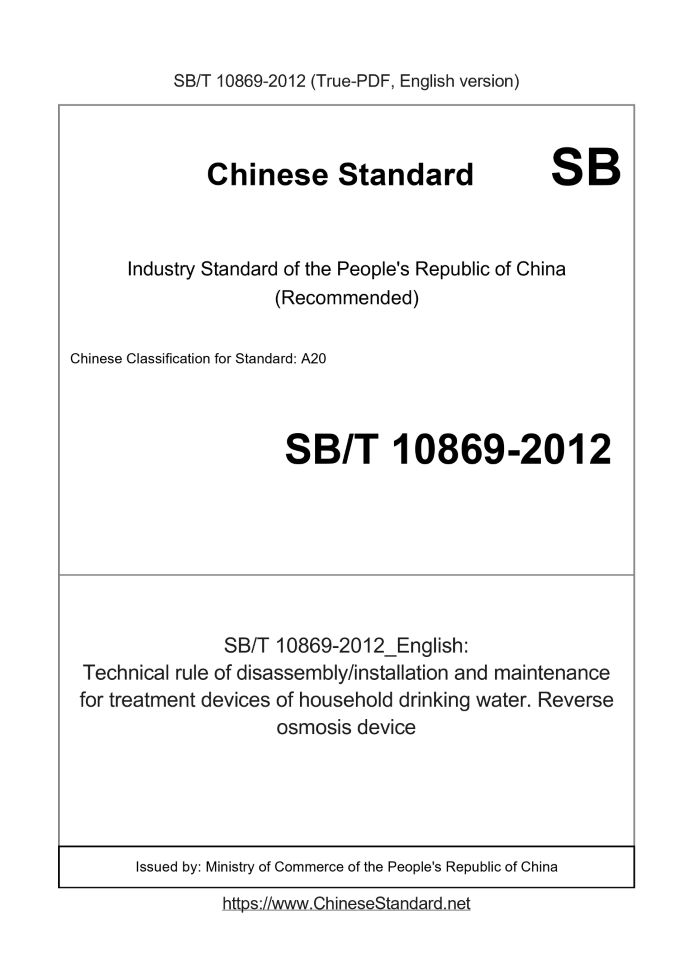 Delivery: <= 3 days. True-PDF full-copy in English will be manually translated and delivered via email. SB/T 10869-2012: Technical rule of disassembly/installation and maintenance for treatment devices of household drinking water. Reverse osmosis device Status: Valid