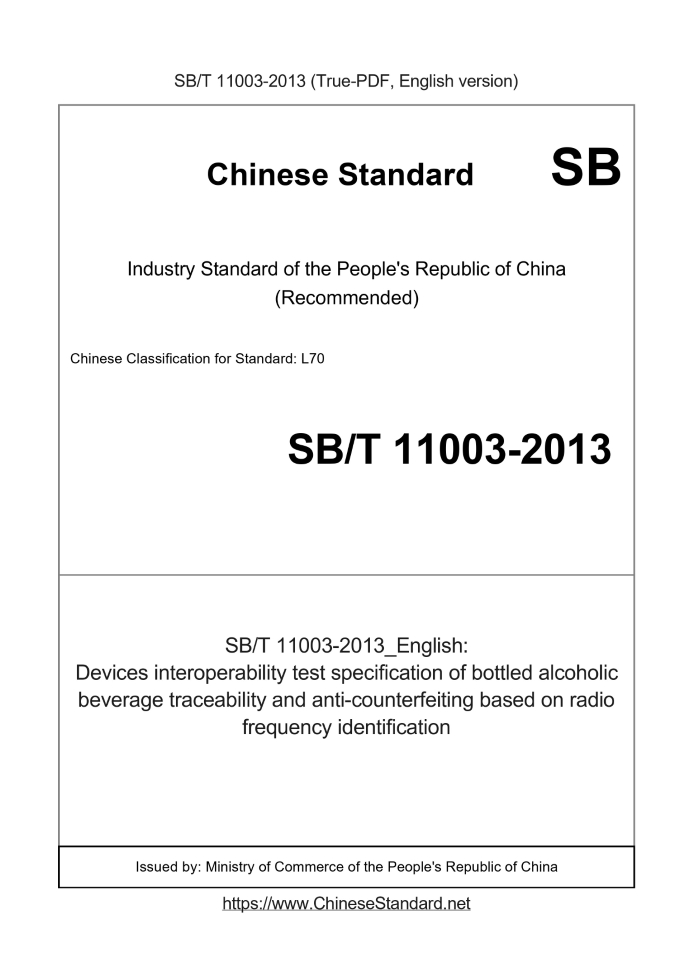 Delivery: <= 3 days. True-PDF full-copy in English will be manually translated and delivered via email. SB/T 11003-2013: Devices interoperability test specification of bottled alcoholic beverage traceability and anti-counterfeiting based on radio frequency identification Status: Valid