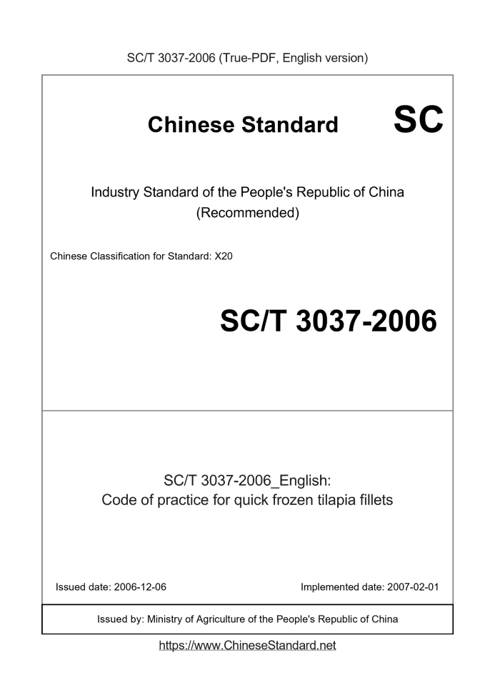 | SC/T 3037-2006 | English | 229 | Add to Cart | 3 days [Need to translate] | Code of practice for quick frozen tilapia fillets |