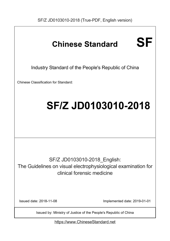 Basic dataStandard ID: SF/Z JD0103010-2018 (SF/ZJD0103010-2018)Description (Translated English): The Guidelines on visual electrophysiological examination for clinical forensic medicine Sector / Industry: Chinese Industry Standard Date of Issue: 2018-11-08 Date of Implementation: 2019-01-01 Regulation (derived from): Judicial Announcement (2018) No. 139 Issuing agency(ies): Ministry of Justice of the People's Republic of China Tips & Frequently Asked Questions:Question 1: How long will the true-PDF of SFZJD0103010-2018_English be delivered?Answer: Upon your order, we will start to translate SFZJD0103010-2018_English as soon as possible, and keep you informed of the progress. The lead time is typically 1 ~ 3 working days. The lengthier the document the longer the lead time.Question 2: Can I share the purchased PDF of SFZJD0103010-2018_English with my colleagues?Answer: Yes. The purchased PDF of SFZJD0103010-2018_English will be deemed to be sold to your employer/organization who actually pays for it, including your colleagues and your employer's intranet.Question 3: Does the price include tax/VAT?Answer: Yes. Our tax invoice, downloaded/delivered in 9 seconds, includes all tax/VAT and complies with 100+ countries' tax regulations (tax exempted in 100+ countries) -- See Avoidance of Double Taxation Agreements (DTAs): List of DTAs signed between Singapore and 100+ countriesQuestion 4: Do you accept my currency other than USD?Answer: Yes. If you need your currency to be printed on the invoice, please write an email to Sales@ChineseStandard.net. In 2 working-hours, we will create a special link for you to pay in any currencies. Otherwise, follow the normal steps: Add to Cart -- Checkout -- Select your currency to pay. |