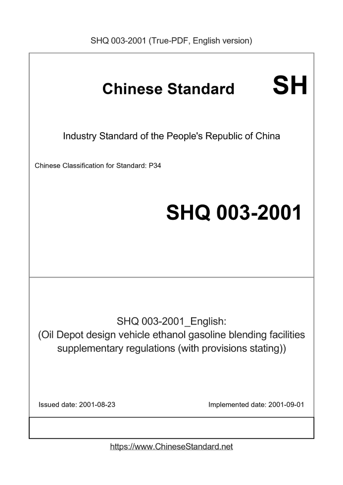 Delivery: <= 4 days. True-PDF full-copy in English will be manually translated and delivered via email. SHQ003-2001: (Oil Depot design vehicle ethanol gasoline blending facilities supplementary regulations (with provisions stating)) Status: Valid