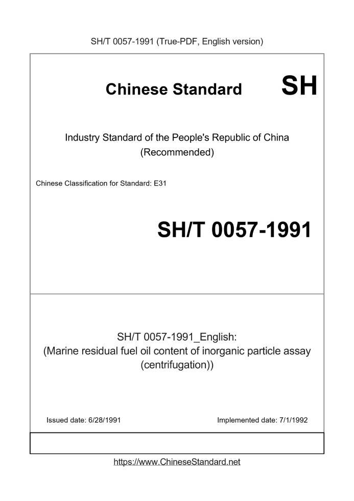 Delivery: <= 2 days. True-PDF full-copy in English will be manually translated and delivered via email. SH/T 0057-1991: (Marine residual fuel oil content of inorganic particle assay (centrifugation)) Status: Obsolete