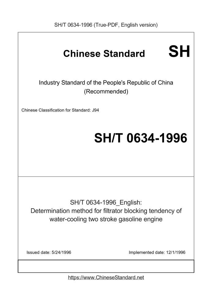 Delivery: <= 3 days. True-PDF full-copy in English will be manually translated and delivered via email. SH/T 0634-1996: Determination method for filtrator blocking tendency of water-cooling two stroke gasoline engine