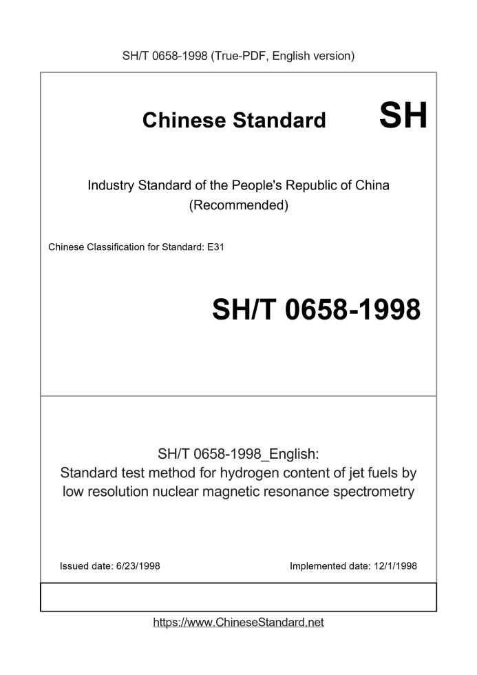 Delivery: <= 3 days. True-PDF full-copy in English will be manually translated and delivered via email. SH/T 0658-1998: Standard test method for hydrogen content of jet fuels by low resolution nuclear magnetic resonance spectrometry