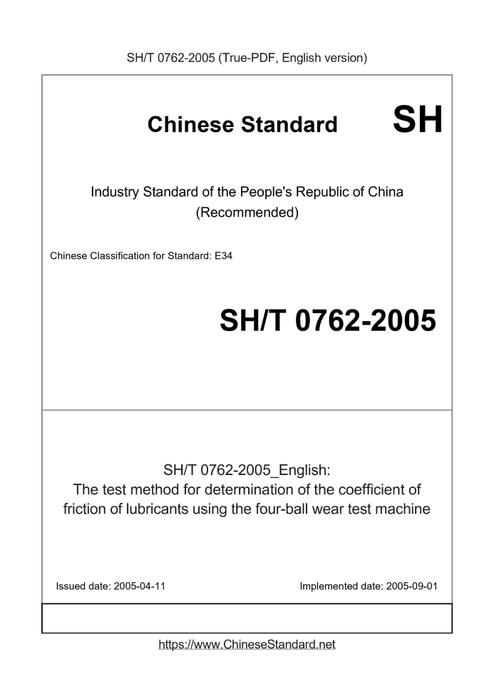 Delivery: <= 3 days. True-PDF full-copy in English will be manually translated and delivered via email. SH/T 0762-2005: The test method for determination of the coefficient of friction of lubricants using the four-ball wear test machine Status: Valid