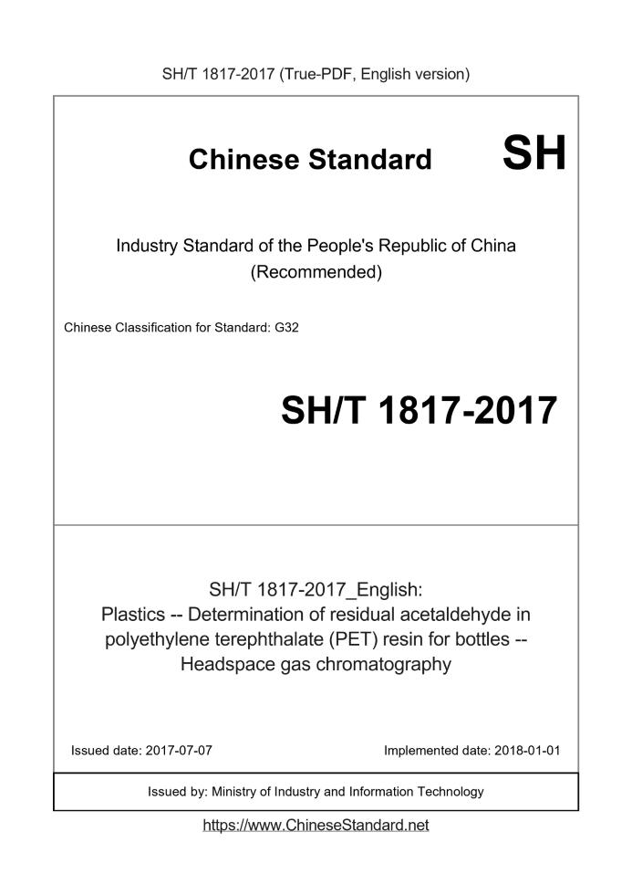 Delivery: <= 3 days. True-PDF full-copy in English will be manually translated and delivered via email. SH/T 1817-2017: Plastics -- Determination of residual acetaldehyde in polyethylene terephthalate (PET) resin for bottles -- Headspace gas chromatography Status: Valid