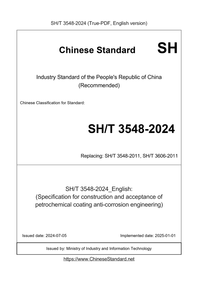 Delivery: <= 7 days. True-PDF full-copy in English will be manually translated and delivered via email. SH/T 3548-2024: (Specification for construction and acceptance of petrochemical coating anti-corrosion engineering) Status: Valid SH/T 3548: Historical versions