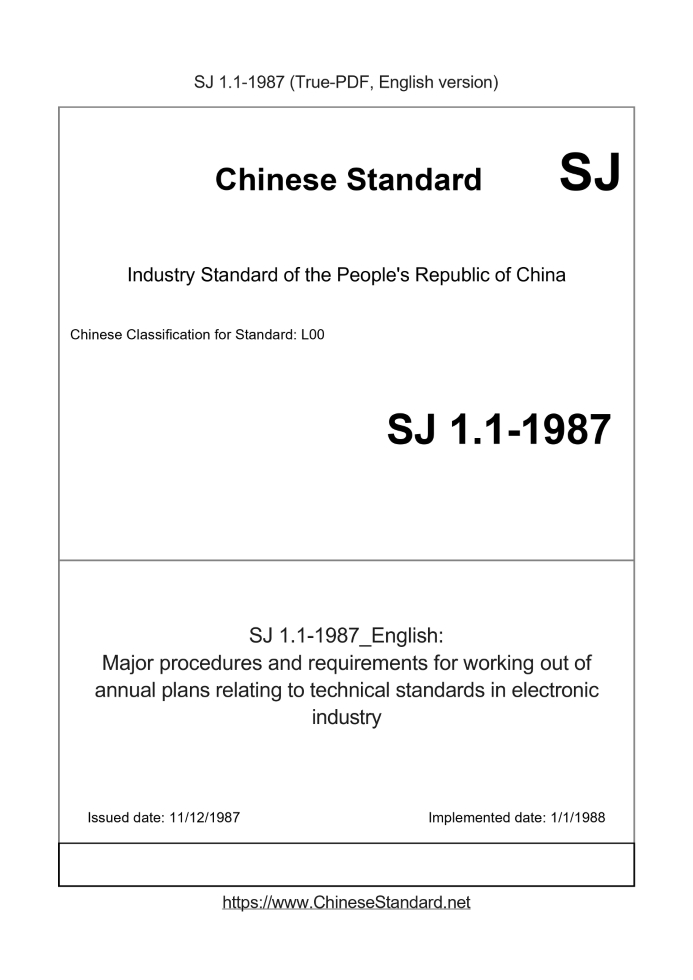 Delivery: <= 3 days. True-PDF full-copy in English will be manually translated and delivered via email. SJ 1.1-1987: Major procedures and requirements for working out of annual plans relating to technical standards in electronic industry Status: Obsolete