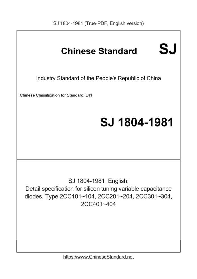 | SJ 1804-1981 English PDFUS$199.00 ยท In stock Delivery: <= 2 days. True-PDF full-copy in English will be manually translated and delivered via email. SJ 1804-1981: Detail specification for silicon tuning variable capacitance diodes, Type 2CC101~104, 2CC201~204, 2CC301~304, 2CC401~404 Status: Obsolete