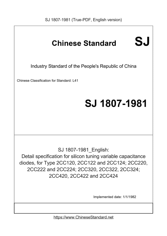 | SJ 1807-1981 English PDFUS$359.00 ยท In stock Delivery: <= 3 days. True-PDF full-copy in English will be manually translated and delivered via email. SJ 1807-1981: Detail specification for silicon tuning variable capacitance diodes, for Type 2CC120, 2CC122 and 2CC124; 2CC220, 2CC222 and 2CC224; 2CC320, 2CC322, 2CC324; 2CC420, 2CC422 and 2CC424 Status: Obsolete