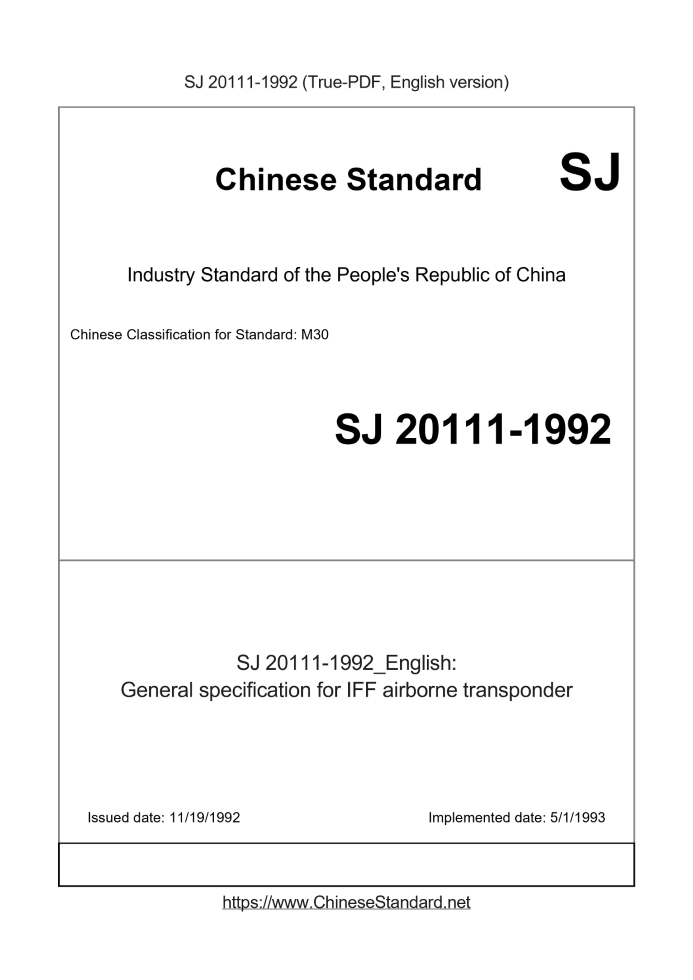| SJ 20111-1992 English PDFUS$629.00 ยท In stock Delivery: <= 3 days. True-PDF full-copy in English will be manually translated and delivered via email. SJ 20111-1992: General specification for IFF airborne transponder