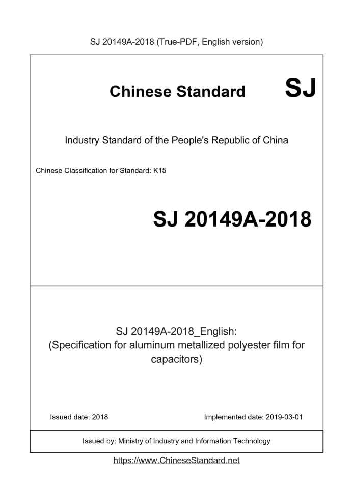 Delivery: <= 3 days. True-PDF full-copy in English will be manually translated and delivered via email. SJ20149A-2018: (Specification for aluminum metallized polyester film for capacitors)