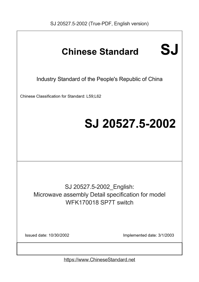 Basic dataStandard ID: SJ 20527.5-2002 (SJ20527.5-2002)Description (Translated English): Microwave assembly Detail specification for model WFK170018 SP7T switch Sector / Industry: Electronics Industry Standard Classification of Chinese Standard: L59;L62 Date of Issue: 10/30/2002 Date of Implementation: 3/1/2003 Summary: This standard specifies the microwave components WFK170018 single-pole seven-throw switch in detail. This standard applies to the development, production and procurement of switches. |
