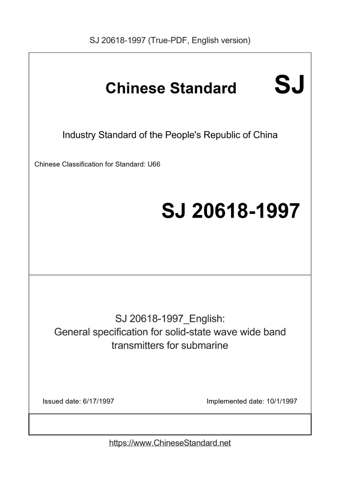 Delivery: <= 3 days. True-PDF full-copy in English will be manually translated and delivered via email. SJ 20618-1997: General specification for solid-state wave wide band transmitters for submarine