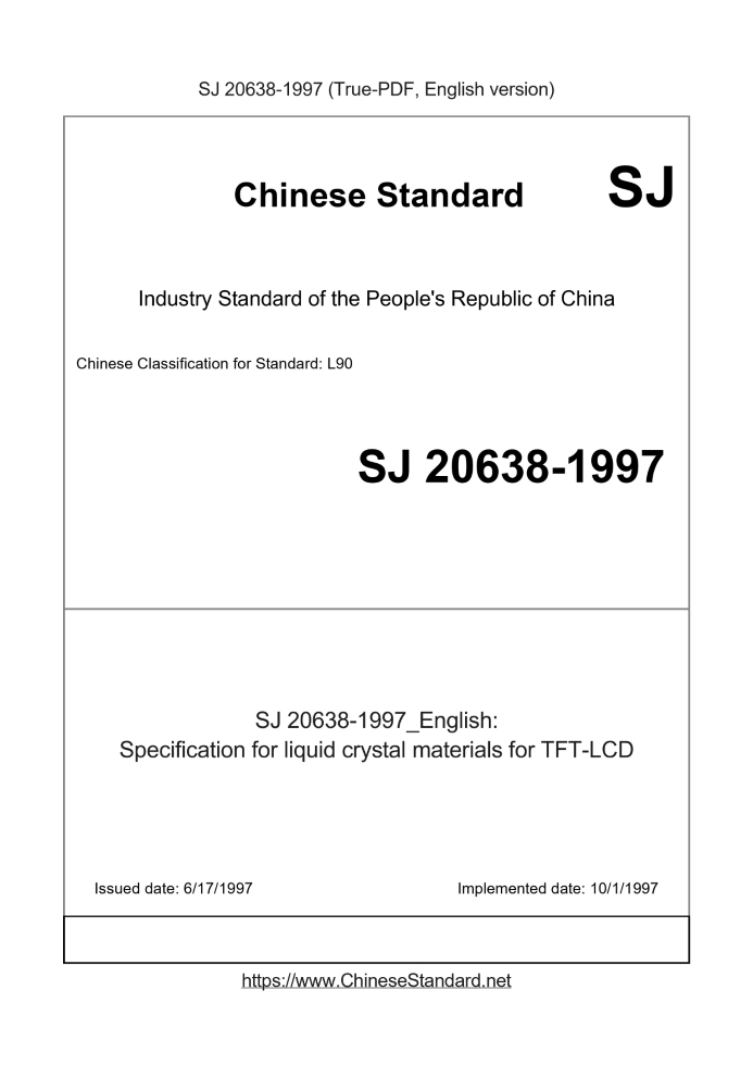 Delivery: <= 3 days. True-PDF full-copy in English will be manually translated and delivered via email. SJ 20638-1997: Specification for liquid crystal materials for TFT-LCD