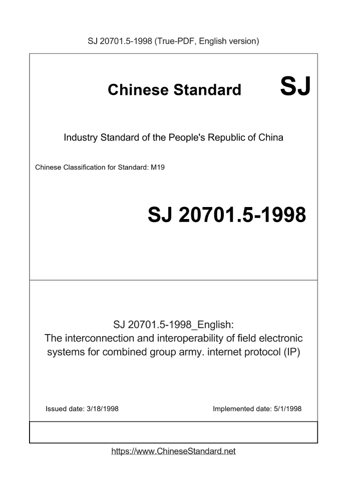 Basic dataStandard ID: SJ 20701.5-1998 (SJ20701.5-1998)Description (Translated English): The interconnection and interoperability of field electronic systems for combined group army. internet protocol (IP) Sector / Industry: Electronics Industry Standard Classification of Chinese Standard: M19 Classification of International Standard: 33.040.01 Date of Issue: 3/18/1998 Date of Implementation: 5/1/1998 Summary: This standard specifies the Internet Association of Synthetic Group Army Electronic Systems Computer Network. This standard applies to the synthesis of the Group Army field of electronic systems in a number of network interconnection, the choice of Internet protocols. Tips & Frequently Asked Questions:Question 1: How long will the true-PDF of SJ 20701.5-1998_English be delivered?Answer: Upon your order, we will start to translate SJ 20701.5-1998_English as soon as possible, and keep you informed of the progress. The lead time is typically 1 ~ 3 working days. The lengthier the document the longer the lead time.Question 2: Can I share the purchased PDF of SJ 20701.5-1998_English with my colleagues?Answer: Yes. The purchased PDF of SJ 20701.5-1998_English will be deemed to be sold to your employer/organization who actually pays for it, including your colleagues and your employer's intranet.Question 3: Does the price include tax/VAT?Answer: Yes. Our tax invoice, downloaded/delivered in 9 seconds, includes all tax/VAT and complies with 100+ countries' tax regulations (tax exempted in 100+ countries) -- See Avoidance of Double Taxation Agreements (DTAs): List of DTAs signed between Singapore and 100+ countriesQuestion 4: Do you accept my currency other than USD?Answer: Yes. If you need your currency to be printed on the invoice, please write an email to Sales@ChineseStandard.net. In 2 working-hours, we will create a special link for you to pay in any currencies. Otherwise, follow the normal steps: Add to Cart -- Checkout -- Select your currency to pay. |