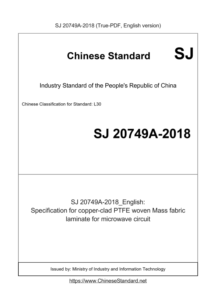 Delivery: <= 4 days. True-PDF full-copy in English will be manually translated and delivered via email. SJ20749A-2018: Specification for copper-clad PTFE woven Mass fabric laminate for microwave circuit Status: Valid