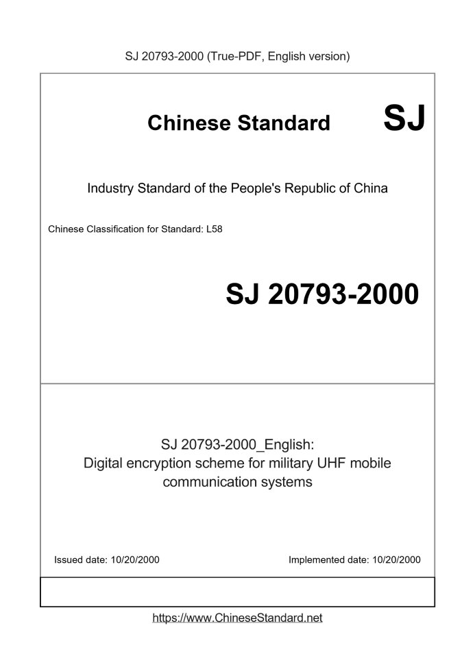 Delivery: <= 6 days. True-PDF full-copy in English will be manually translated and delivered via email. SJ 20793-2000: Digital encryption scheme for military UHF mobile communication systems