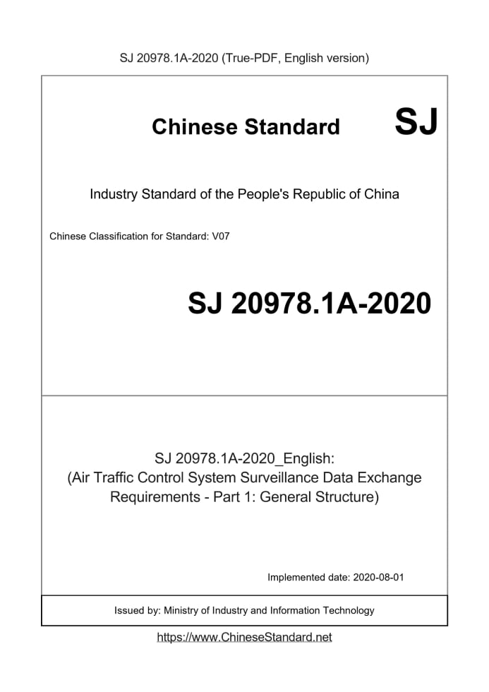 Delivery: <= 3 days. True-PDF full-copy in English will be manually translated and delivered via email. SJ20978.1A-2020: (Air Traffic Control System Surveillance Data Exchange Requirements - Part 1: General Structure) Status: Valid