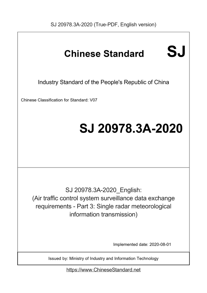 Delivery: <= 4 days. True-PDF full-copy in English will be manually translated and delivered via email. SJ20978.3A-2020: (Air traffic control system surveillance data exchange requirements - Part 3: Single radar meteorological information transmission)