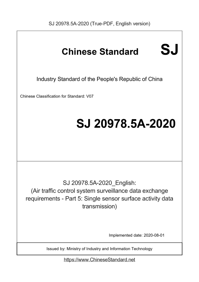 Delivery: <= 6 days. True-PDF full-copy in English will be manually translated and delivered via email. SJ20978.5A-2020: (Air traffic control system surveillance data exchange requirements - Part 5: Single sensor surface activity data transmission) Status: Valid