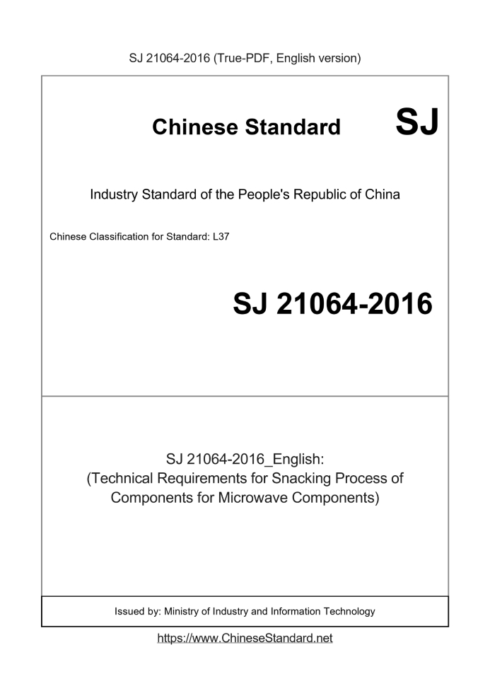 Delivery: <= 3 days. True-PDF full-copy in English will be manually translated and delivered via email. SJ 21064-2016: (Technical Requirements for Snacking Process of Components for Microwave Components) Status: Valid