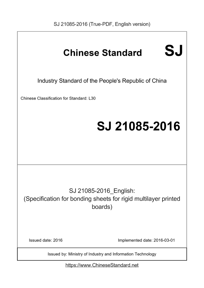 Delivery: <= 4 days. True-PDF full-copy in English will be manually translated and delivered via email. SJ 21085-2016: (Specification for bonding sheets for rigid multilayer printed boards) Status: Valid