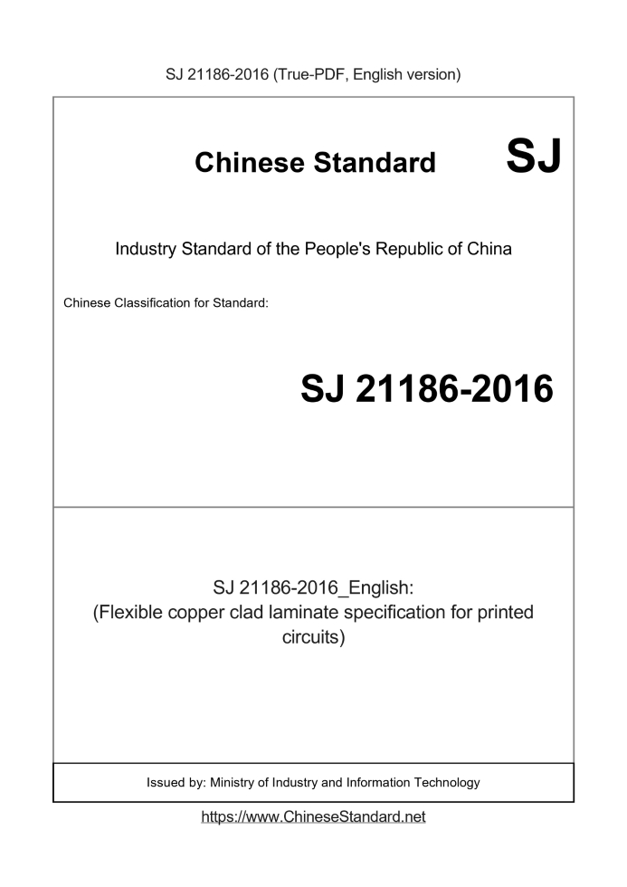 Delivery: <= 4 days. True-PDF full-copy in English will be manually translated and delivered via email. SJ 21186-2016: (Flexible copper clad laminate specification for printed circuits) Status: Valid