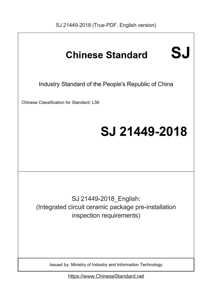 Delivery: <= 3 days. True-PDF full-copy in English will be manually translated and delivered via email. SJ 21449-2018: (Integrated circuit ceramic package pre-installation inspection requirements) Status: Valid