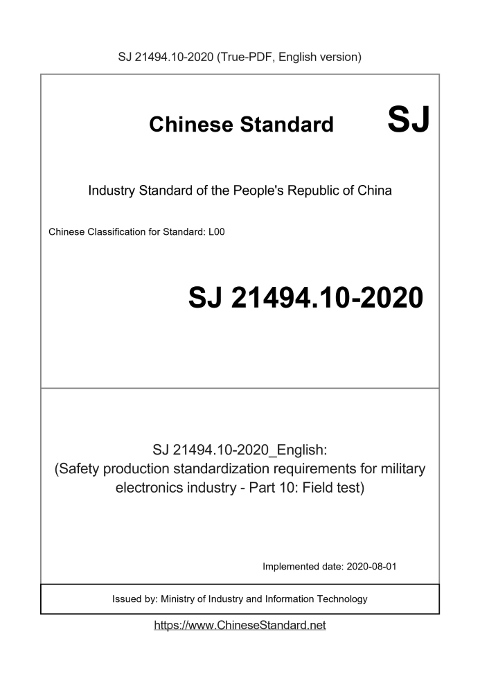 Delivery: <= 7 days. True-PDF full-copy in English will be manually translated and delivered via email. SJ 21494.10-2020: (Safety production standardization requirements for military electronics industry - Part 10: Field test)