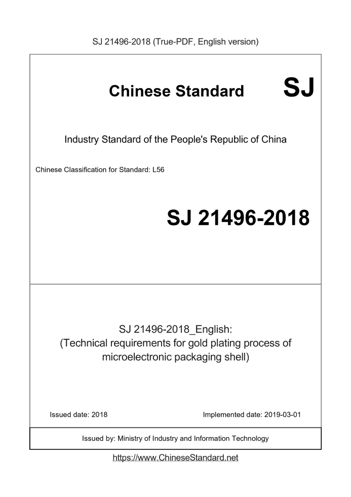 Delivery: <= 3 days. True-PDF full-copy in English will be manually translated and delivered via email. SJ 21496-2018: (Technical requirements for gold plating process of microelectronic packaging shell)