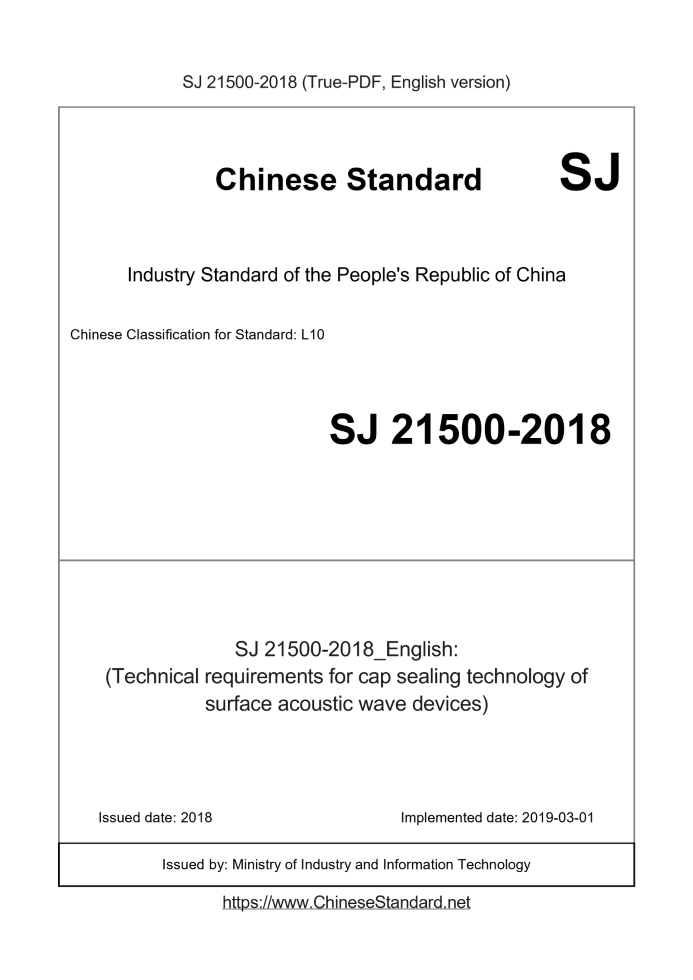 Delivery: <= 3 days. True-PDF full-copy in English will be manually translated and delivered via email. SJ 21500-2018: (Technical requirements for cap sealing technology of surface acoustic wave devices)