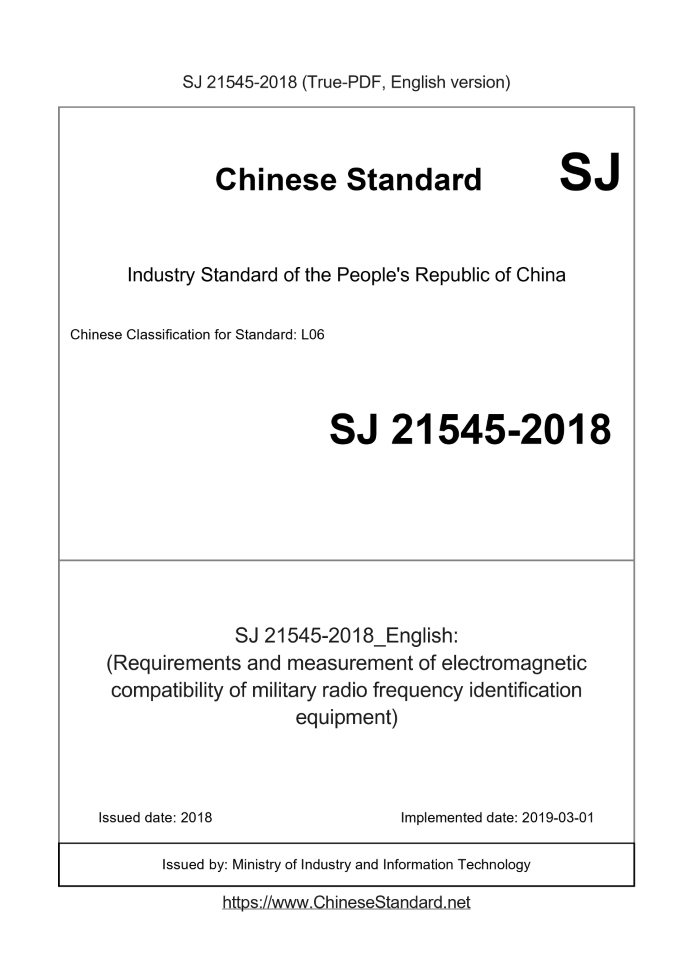 Delivery: <= 6 days. True-PDF full-copy in English will be manually translated and delivered via email. SJ 21545-2018: (Requirements and measurement of electromagnetic compatibility of military radio frequency identification equipment)