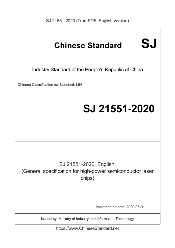 Delivery: <= 3 days. True-PDF full-copy in English will be manually translated and delivered via email. SJ 21551-2020: (General specification for high-power semiconductor laser chips) Status: Valid