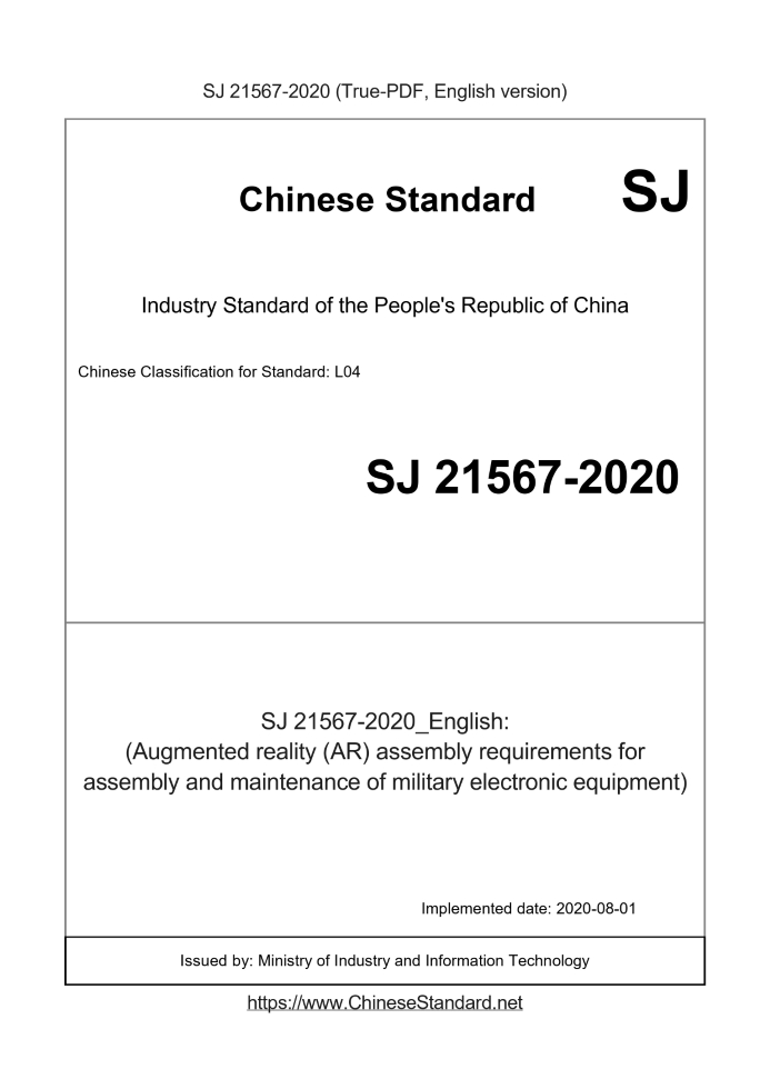 Delivery: <= 3 days. True-PDF full-copy in English will be manually translated and delivered via email. SJ 21567-2020: (Augmented reality (AR) assembly requirements for assembly and maintenance of military electronic equipment)