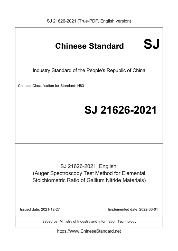 Delivery: <= 3 days. True-PDF full-copy in English will be manually translated and delivered via email. SJ 21626-2021: (Auger Spectroscopy Test Method for Elemental Stoichiometric Ratio of Gallium Nitride Materials) Status: Valid