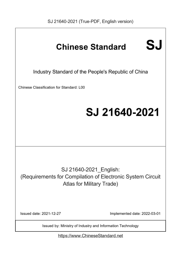 Delivery: <= 4 days. True-PDF full-copy in English will be manually translated and delivered via email. SJ 21640-2021: (Requirements for Compilation of Electronic System Circuit Atlas for Military Trade) Status: Valid