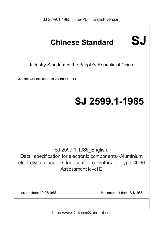 Delivery: <= 3 days. True-PDF full-copy in English will be manually translated and delivered via email. SJ 2599.1-1985: Detail specification for electronic components--Aluminium electrolytic capacitors for use in a. c. motors for Type CD60 Assessment level E Status: Obsolete SJ 2599.1: Historical versions