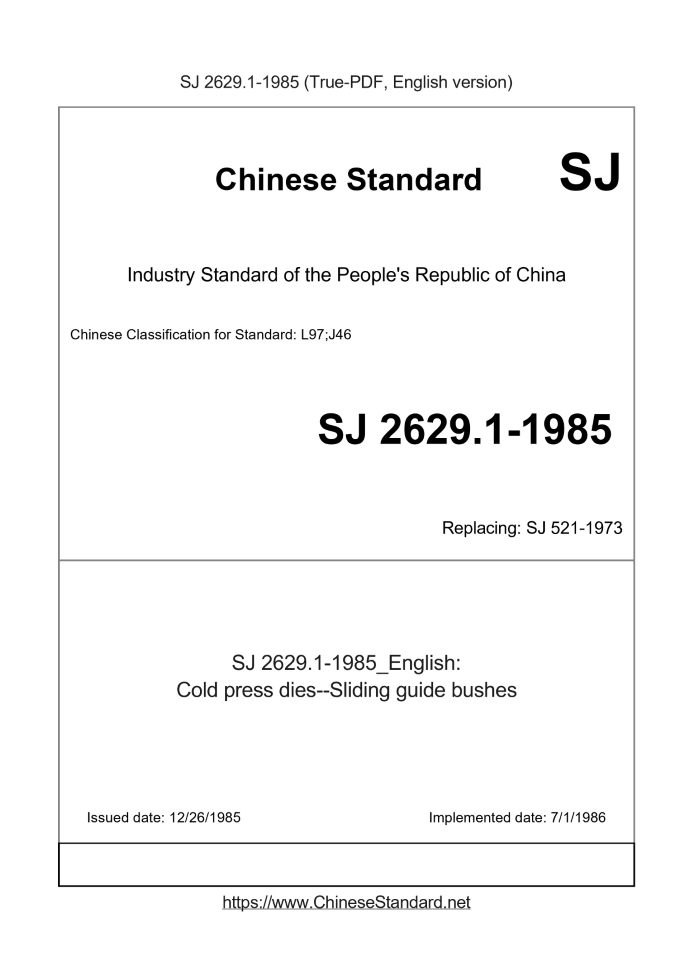 Delivery: <= 2 days. True-PDF full-copy in English will be manually translated and delivered via email. SJ 2629.1-1985: Cold press dies--Sliding guide bushes Status: Obsolete